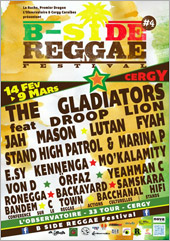 Co-organisé par les associations La Ruche et Premier Dragon, en partenariat avec la salle de L'Observatoire, à Cergy, le B-Side Reggae Festival se tiendra les 14 et 20 février, ainsi que les 7, 8 et 9 mars 2014.